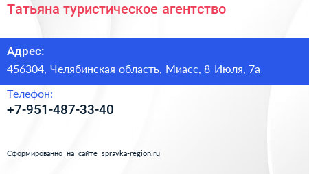 Татьяна, туристическое агентство по адресу 456304, Челябинская область, Миасс, 8 Июля, 7а в дальнейшем Организация, размещена в следующих категориях: