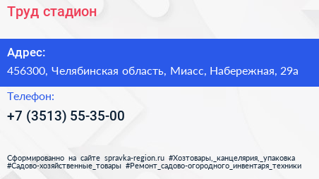 Труд, стадион по адресу 456300, Челябинская область, Миасс, Набережная, 29а в дальнейшем Организация, размещена в следующих категориях: