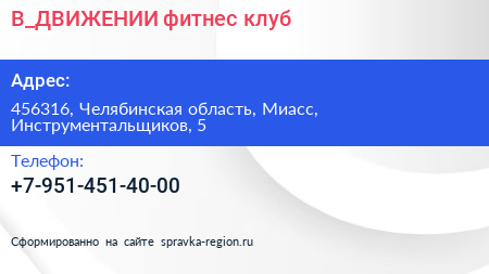 #В_ДВИЖЕНИИ, фитнес-клуб по адресу 456316, Челябинская область, Миасс, Инструментальщиков, 5 в дальнейшем Организация, размещена в следующих категориях: