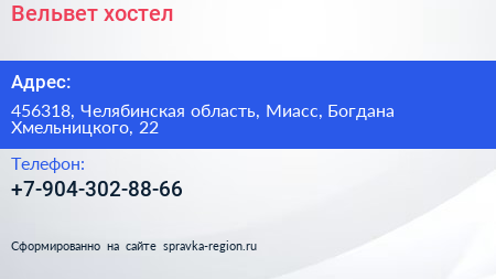 Вельвет, хостел по адресу 456318, Челябинская область, Миасс, Богдана Хмельницкого, 22 в дальнейшем Организация, размещена в следующих категориях: