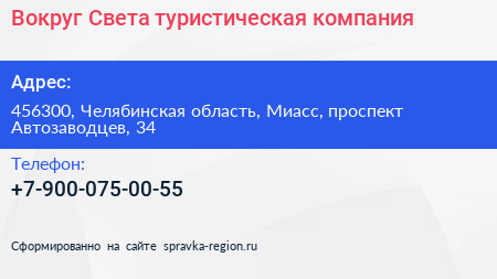 Вокруг Света, туристическая компания по адресу 456300, Челябинская область, Миасс, проспект Автозаводцев, 34 в дальнейшем Организация, размещена в следующих категориях: