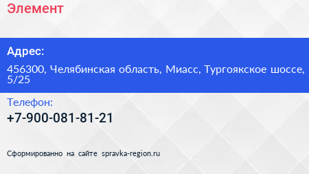 Элемент по адресу 456300, Челябинская область, Миасс, Тургоякское шоссе, 5/25 в дальнейшем Организация, размещена в следующих категориях: