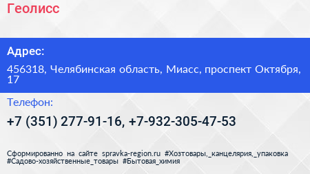 Геолисс по адресу 456318, Челябинская область, Миасс, проспект Октября, 17 в дальнейшем Организация, размещена в следующих категориях: