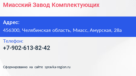 Миасский Завод Комплектующих по адресу 456300, Челябинская область, Миасс, Амурская, 28а в дальнейшем Организация, размещена в следующих категориях: