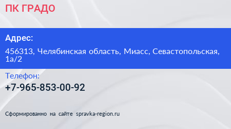 ПК ГРАДО по адресу 456313, Челябинская область, Миасс, Севастопольская, 1а/2 в дальнейшем Организация, размещена в следующих категориях: