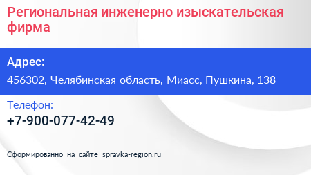 Региональная инженерно-изыскательская фирма по адресу 456302, Челябинская область, Миасс, Пушкина, 138 в дальнейшем Организация, размещена в следующих категориях: