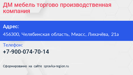 ДМ мебель, торгово-производственная компания по адресу 456300, Челябинская область, Миасс, Лихачёва, 21а в дальнейшем Организация, размещена в следующих категориях: