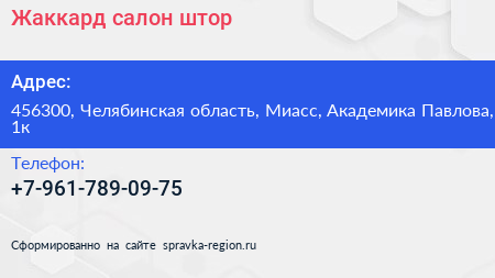 Жаккард, салон штор по адресу 456300, Челябинская область, Миасс, Академика Павлова, 1к в дальнейшем Организация, размещена в следующих категориях: