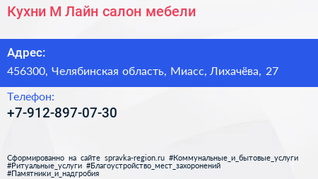 Кухни М-Лайн, салон мебели по адресу 456300, Челябинская область, Миасс, Лихачёва, 27 в дальнейшем Организация, размещена в следующих категориях: