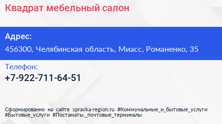Квадрат, мебельный салон по адресу 456300, Челябинская область, Миасс, Романенко, 35 в дальнейшем Организация, размещена в следующих категориях: