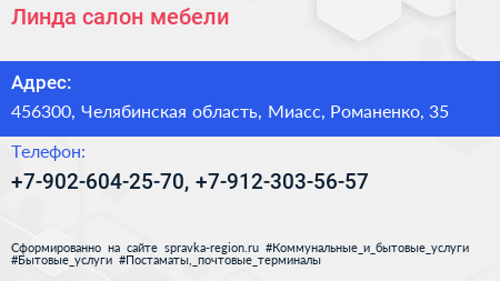 Линда, салон мебели по адресу 456300, Челябинская область, Миасс, Романенко, 35 в дальнейшем Организация, размещена в следующих категориях: