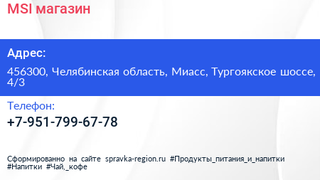 MSI, магазин по адресу 456300, Челябинская область, Миасс, Тургоякское шоссе, 4/3 в дальнейшем Организация, размещена в следующих категориях: