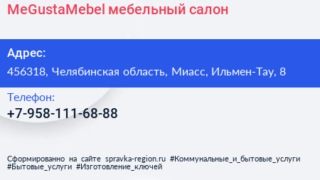 MeGustaMebel, мебельный салон по адресу 456318, Челябинская область, Миасс, Ильмен-Тау, 8 в дальнейшем Организация, размещена в следующих категориях: