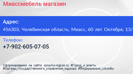 Миассмебель, магазин по адресу 456303, Челябинская область, Миасс, 60 лет Октября, 13/2 в дальнейшем Организация, размещена в следующих категориях: