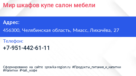 Мир шкафов-купе, салон мебели по адресу 456300, Челябинская область, Миасс, Лихачёва, 27 в дальнейшем Организация, размещена в следующих категориях: