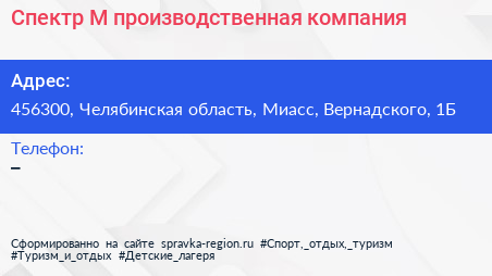 Спектр-М, производственная компания по адресу 456300, Челябинская область, Миасс, Вернадского, 1Б в дальнейшем Организация, размещена в следующих категориях: