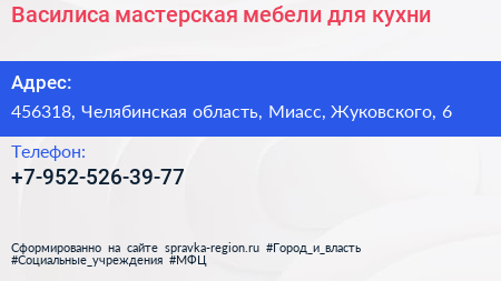 Василиса, мастерская мебели для кухни по адресу 456318, Челябинская область, Миасс, Жуковского, 6 в дальнейшем Организация, размещена в следующих категориях: