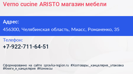 Verno cucine & ARISTO, магазин мебели по адресу 456300, Челябинская область, Миасс, Романенко, 35 в дальнейшем Организация, размещена в следующих категориях: