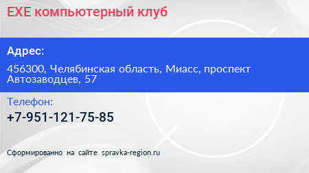 .EXE, компьютерный клуб по адресу 456300, Челябинская область, Миасс, проспект Автозаводцев, 57 в дальнейшем Организация, размещена в следующих категориях: