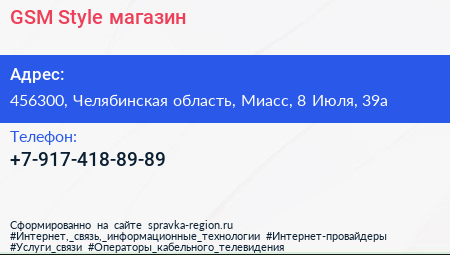 GSM Style, магазин по адресу 456300, Челябинская область, Миасс, 8 Июля, 39а в дальнейшем Организация, размещена в следующих категориях: