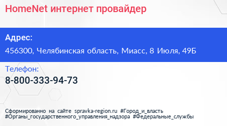 HomeNet, интернет-провайдер по адресу 456300, Челябинская область, Миасс, 8 Июля, 49Б в дальнейшем Организация, размещена в следующих категориях: