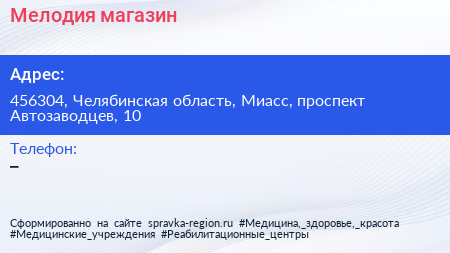 Мелодия, магазин по адресу 456304, Челябинская область, Миасс, проспект Автозаводцев, 10 в дальнейшем Организация, размещена в следующих категориях: