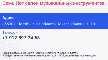 Семь Нот, салон музыкальных инструментов по адресу 456304, Челябинская область, Миасс, Калинина, 10 в дальнейшем Организация, размещена в следующих категориях: