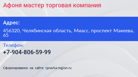 Афоня-мастер, торговая компания по адресу 456320, Челябинская область, Миасс, проспект Макеева, 65 в дальнейшем Организация, размещена в следующих категориях: