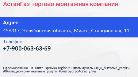 АстанГаз, торгово-монтажная компания по адресу 456317, Челябинская область, Миасс, Станционная, 11 в дальнейшем Организация, размещена в следующих категориях: