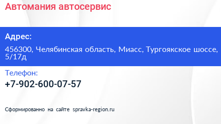 Автомания, автосервис по адресу 456300, Челябинская область, Миасс, Тургоякское шоссе, 5/17д в дальнейшем Организация, размещена в следующих категориях: