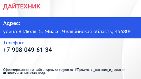 ДАЙТЕХНИК по адресу улица 8 Июля, 5, Миасс, Челябинская область, 456304 в дальнейшем Организация, размещена в следующих категориях: