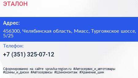 ЭТАЛОН по адресу 456300, Челябинская область, Миасс, Тургоякское шоссе, 5/25 в дальнейшем Организация, размещена в следующих категориях: