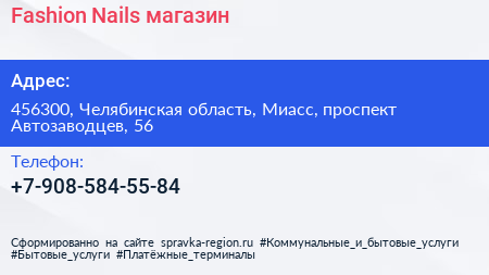 Fashion Nails, магазин по адресу 456300, Челябинская область, Миасс, проспект Автозаводцев, 56 в дальнейшем Организация, размещена в следующих категориях: