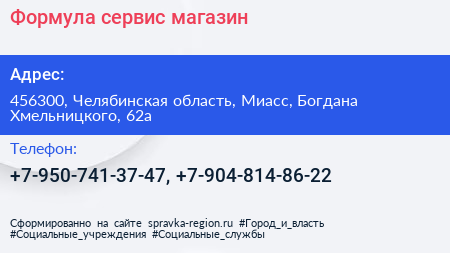 Формула, сервис-магазин по адресу 456300, Челябинская область, Миасс, Богдана Хмельницкого, 62а в дальнейшем Организация, размещена в следующих категориях: