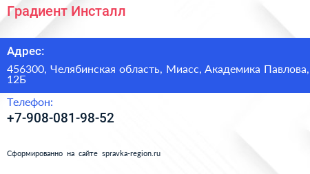 Градиент-Инсталл по адресу 456300, Челябинская область, Миасс, Академика Павлова, 12Б в дальнейшем Организация, размещена в следующих категориях: