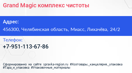 Grand Magic, комплекс чистоты по адресу 456300, Челябинская область, Миасс, Лихачёва, 24/2 в дальнейшем Организация, размещена в следующих категориях:
