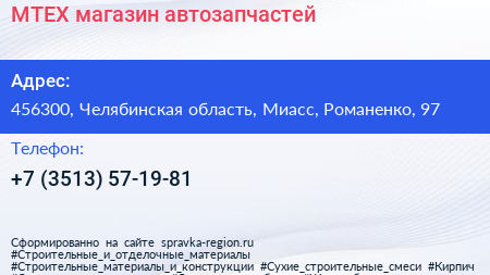 МТЕХ, магазин автозапчастей по адресу 456300, Челябинская область, Миасс, Романенко, 97 в дальнейшем Организация, размещена в следующих категориях: