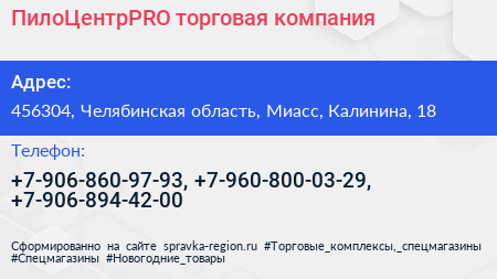 ПилоЦентрPRO, торговая компания по адресу 456304, Челябинская область, Миасс, Калинина, 18 в дальнейшем Организация, размещена в следующих категориях: