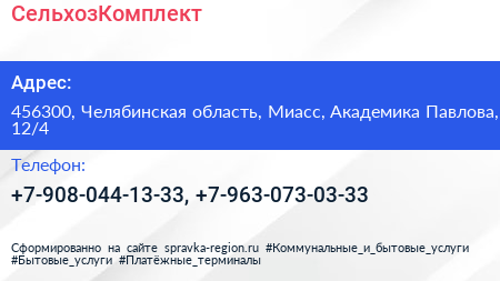 СельхозКомплект по адресу 456300, Челябинская область, Миасс, Академика Павлова, 12/4 в дальнейшем Организация, размещена в следующих категориях: