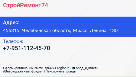 СтройРемонт74 по адресу 456315, Челябинская область, Миасс, Ленина, 130 в дальнейшем Организация, размещена в следующих категориях: