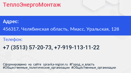 ТеплоЭнергоМонтаж по адресу 456317, Челябинская область, Миасс, Уральская, 128 в дальнейшем Организация, размещена в следующих категориях: