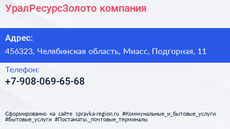 УралРесурсЗолото, компания по адресу 456323, Челябинская область, Миасс, Подгорная, 11 в дальнейшем Организация, размещена в следующих категориях: