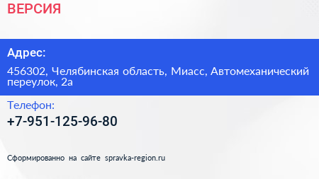 ВЕРСИЯ по адресу 456302, Челябинская область, Миасс, Автомеханический переулок, 2а в дальнейшем Организация, размещена в следующих категориях: