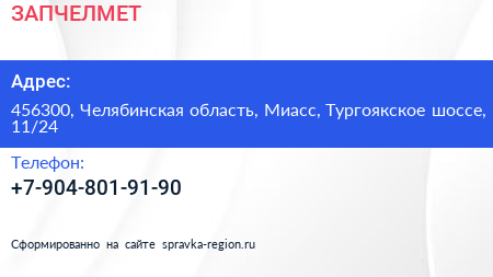 ЗАПЧЕЛМЕТ по адресу 456300, Челябинская область, Миасс, Тургоякское шоссе, 11/24 в дальнейшем Организация, размещена в следующих категориях: