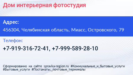 Дом, интерьерная фотостудия по адресу 456304, Челябинская область, Миасс, Островского, 79 в дальнейшем Организация, размещена в следующих категориях: