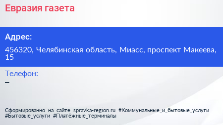 Евразия, газета по адресу 456320, Челябинская область, Миасс, проспект Макеева, 15 в дальнейшем Организация, размещена в следующих категориях: