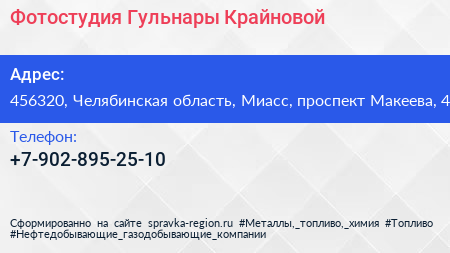 Фотостудия Гульнары Крайновой по адресу 456320, Челябинская область, Миасс, проспект Макеева, 4 в дальнейшем Организация, размещена в следующих категориях: