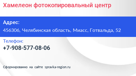 Хамелеон, фотокопировальный центр по адресу 456306, Челябинская область, Миасс, Готвальда, 52 в дальнейшем Организация, размещена в следующих категориях: