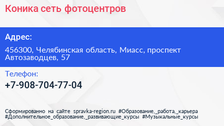 Коника, сеть фотоцентров по адресу 456300, Челябинская область, Миасс, проспект Автозаводцев, 57 в дальнейшем Организация, размещена в следующих категориях: