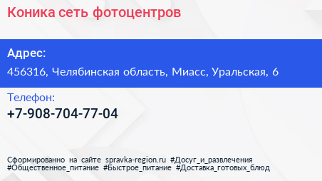 Коника, сеть фотоцентров по адресу 456316, Челябинская область, Миасс, Уральская, 6 в дальнейшем Организация, размещена в следующих категориях: